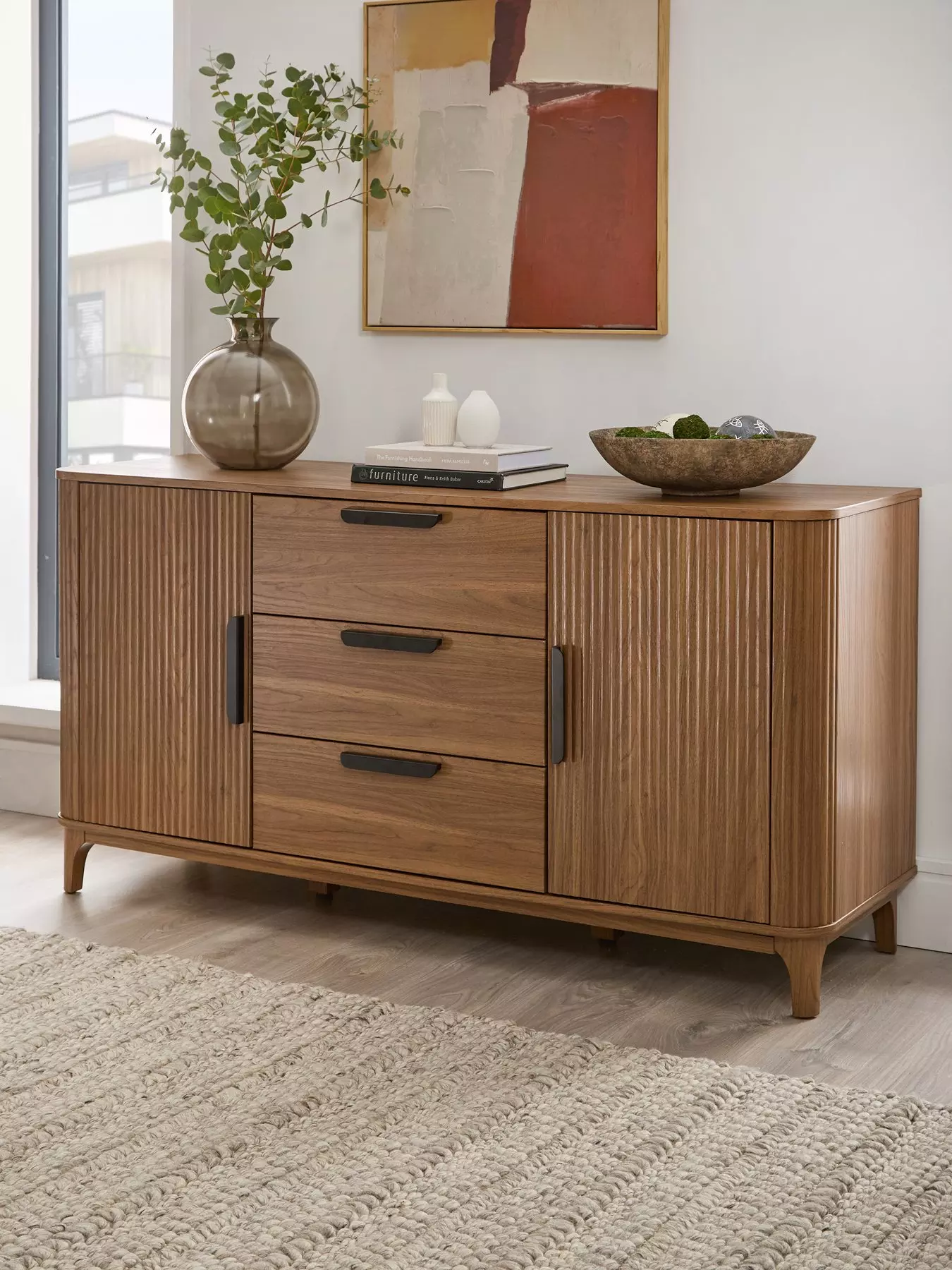 Part of the contemporary Carina collection of furniture, this sideboard has a smooth rounded shape that will contrast strikingly with the straight lines of your walls and other furniture.Key to its stand-out style is the fashionable ribbed detail and richly grained mid oak-effect finish. Two cupboards each contain an adjustable shelf for customised storage, while the centre column of three drawers glide smoothly open on metal runners. This furniture is finished with darkly toned metal handles for a final accent of glam.