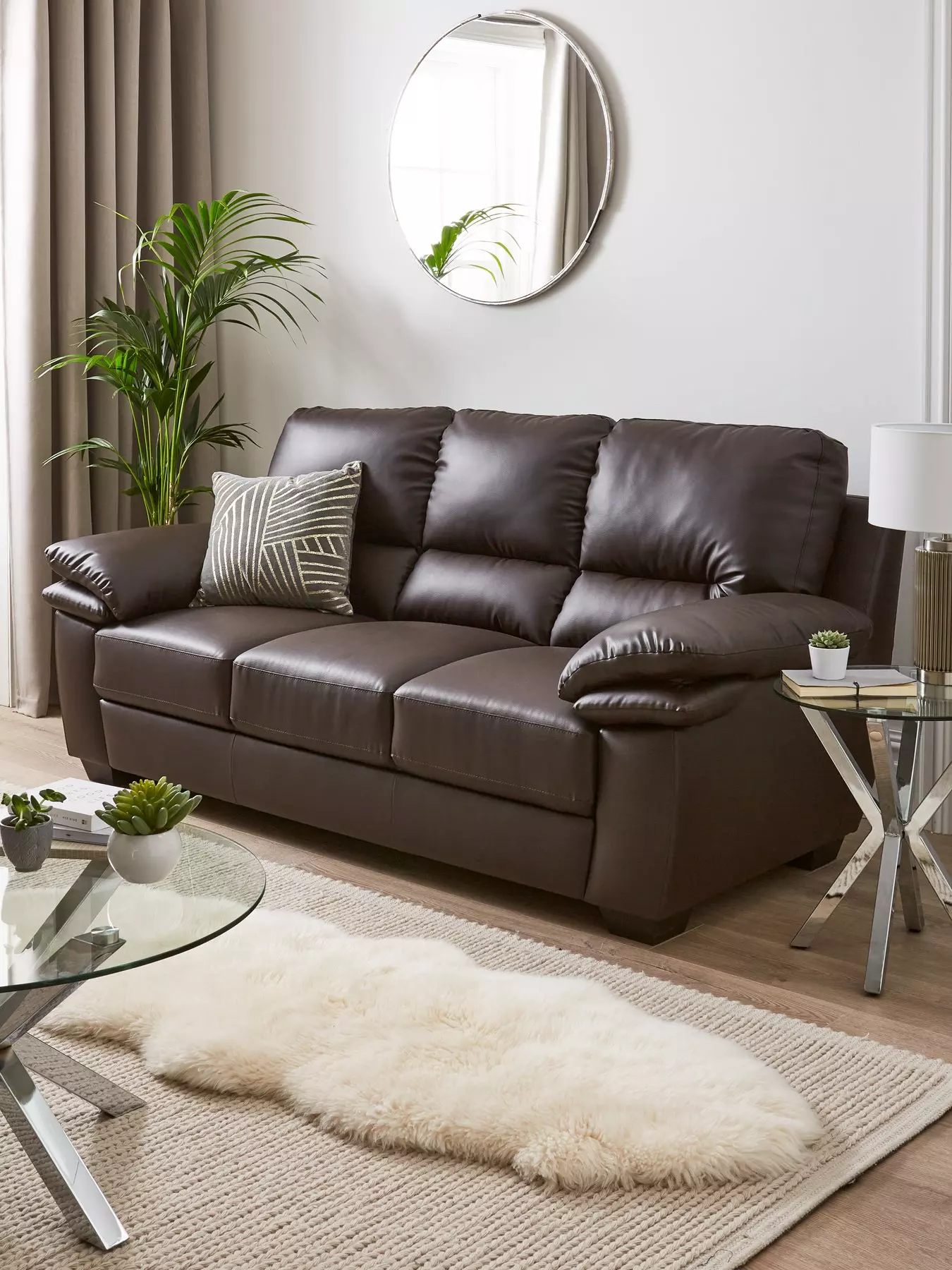 This Leona sofa features a supple faux leather fabric that has a realistic look to let you enjoy the stunning appearance of leather at a far lower price than the real thing. In classic black and chocolate colour options, its chunky proportions are like an inviting hug every time you sit down on it. Comfort comes from the split back cushions and double-layered arm cushions, and it's finished with wooden block feet.