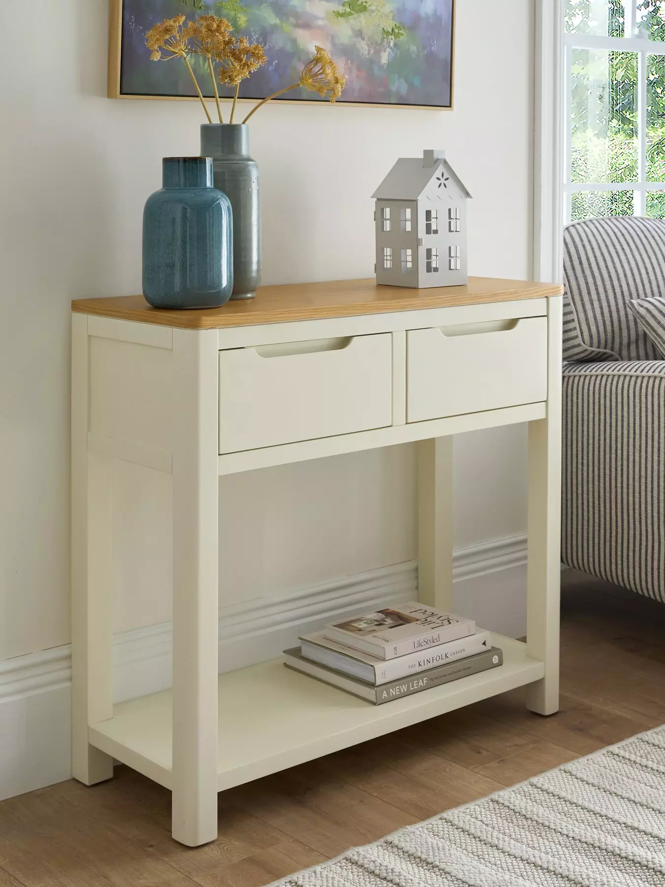 Country cottage cream with contrasting oak-effect top, featuring two storage drawers with modern cut-out handles. Great for placing in a hallway, it's thoughtfully finished with smooth curved corners and a shelf for extra display options. Arrives ready assembled for the ultimate ease.Please remember to measure your available space before ordering.