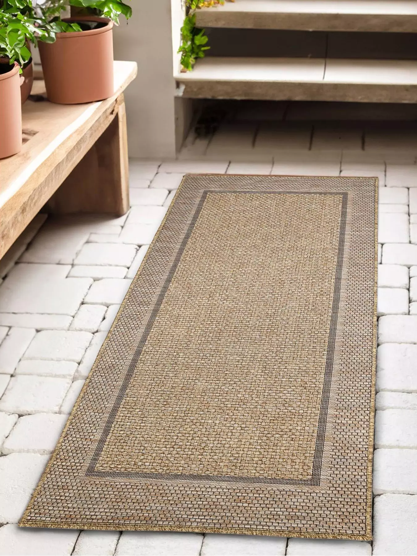 Suitable for indoor and outdoor living, the summer border design is durable and woven in stylish neutral tones to enhance any space with a naturally inspired feel. Use of a rug grip is recommended for indoor use.- Care Instructions: Included