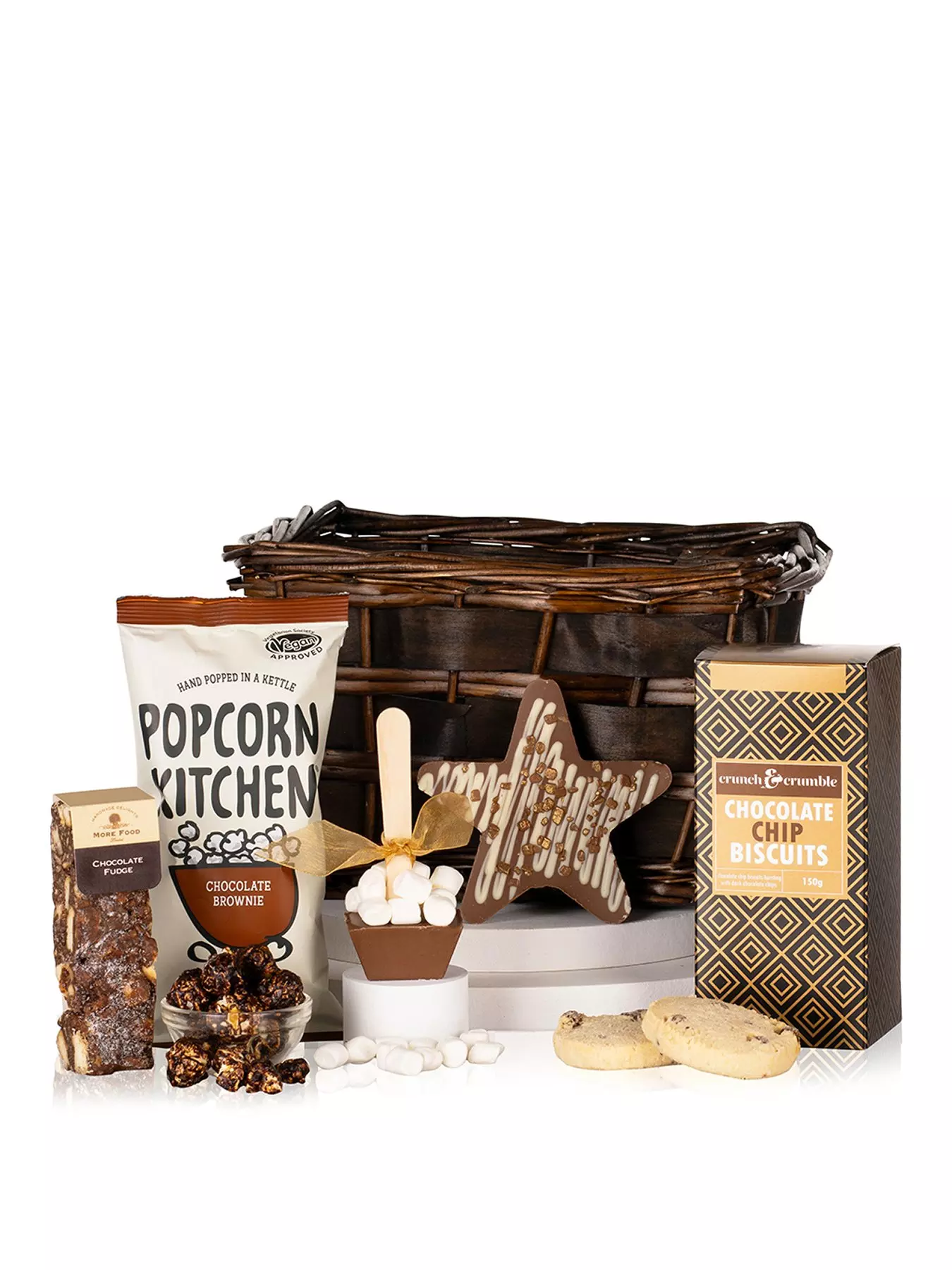 Treat every chocolate enthusiast to the Chocoholics Choice Gift, a luxe assortment of cocoa delights beautifully displayed in a small willow basket with a paper-weave inlay. Ideal for surprising friends, clients, or loved ones, this collection promises a truly indulgent festive experience.Savour the buttery crunch of Crunch & Crumble Chocolate Chip Biscuits and the rich, fudgy goodness of More Food Chocolate Fudge. Enjoy Popcorn Kitchen’s Chocolate Brownie Popcorn, where sweet, chocolate-coated kernels bring a playful twist to snacking.