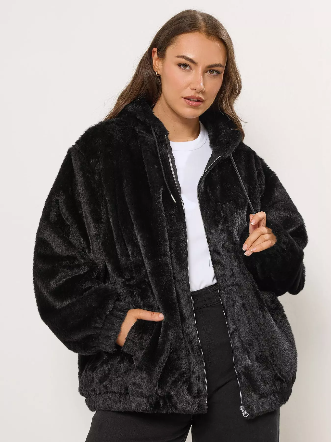YoursCurve Faux Fur Zip Through Hooded Fleece - Black